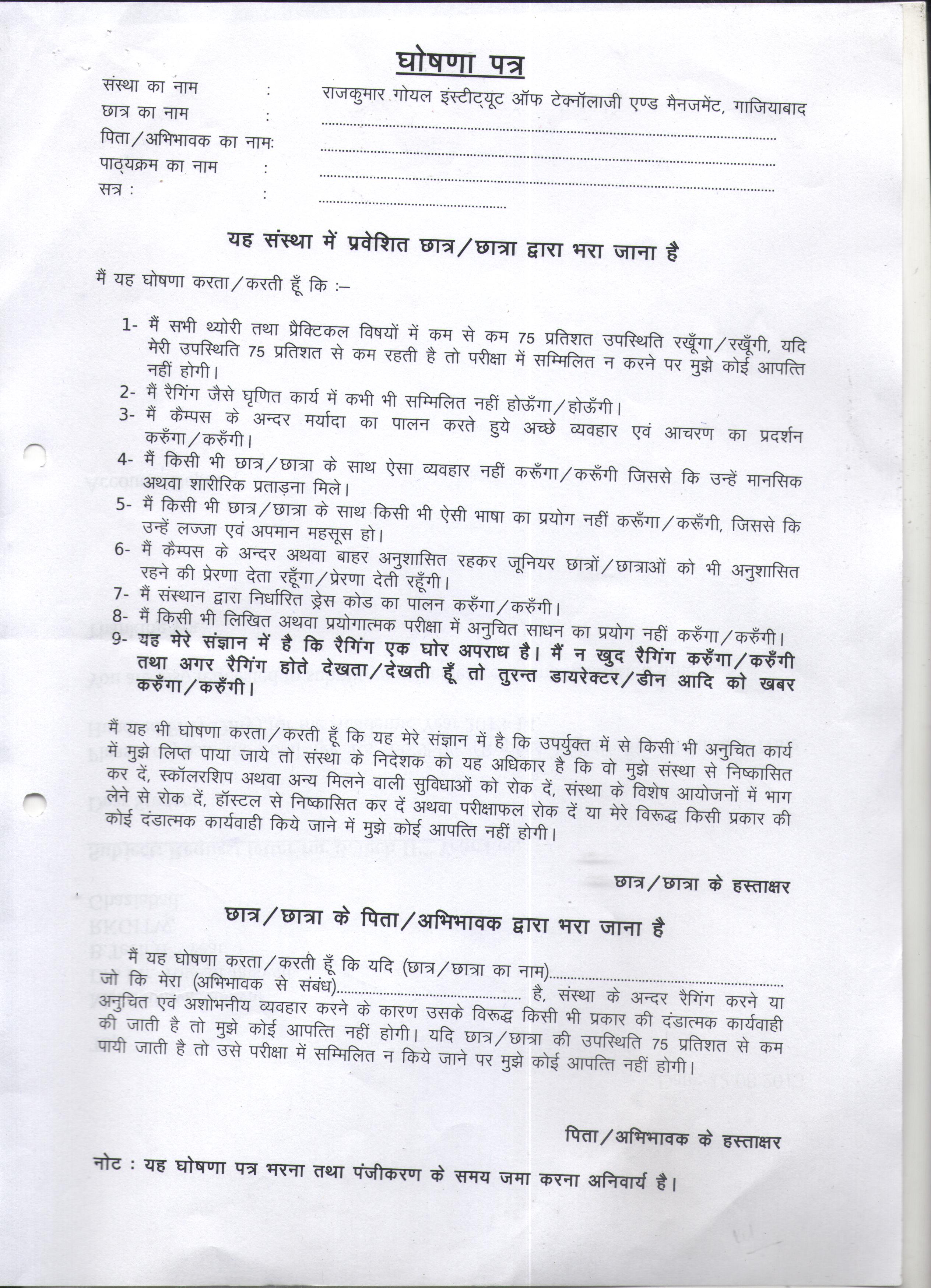 The parents/ guardians of the admitted students will have to give an undertaking on non-judicial stamp paper that their ward's will not indulge in any act of indiscipline. Parents have to give undertaking that if their ward attendance were less than 75% then their ward would be barred. In case of any indiscipline or ragging. she may be expelled from the College/Hostel and may also be subjected to monetary punishment etc. as decided by the Disciplinary Committee of the College.